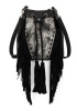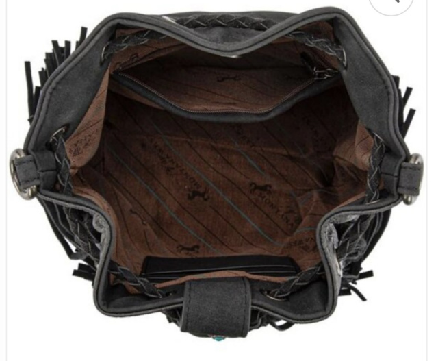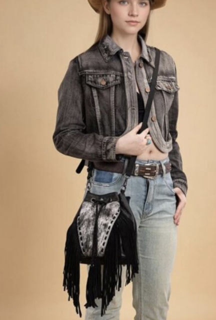 Made of PU leather (soft leather suede-feel), this crossbody has: Genuine hair-on cowhide on the front Floral embossed detail Fringe Drawstring tassels ... Concealed Carry on back.