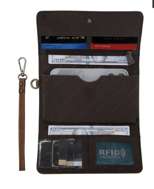 - Multiple card slots, 2 long slot compartments, zippered pocket, and a velcro closure compartment