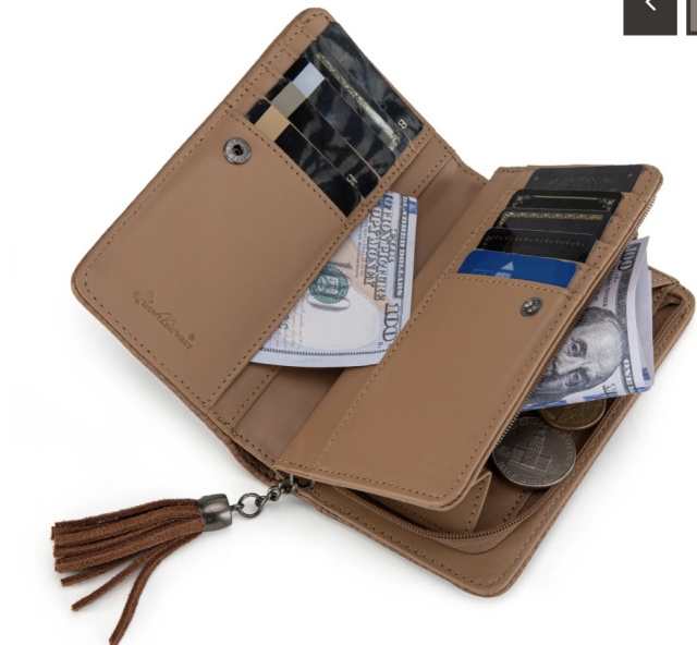 8 credit card slots, 2 slide pockets and a zippered compartment