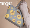 The Wrangler sunflower tote bag is a stylish and functional wide tote bag that combines western charm with everyday practicality, featuring a bold sunflower pattern and branded appliqué. Crafted from durable vegan leather, this Wrangler tote bag features a top zipper closure and ergonomic double handles for a secure, comfortable carry.